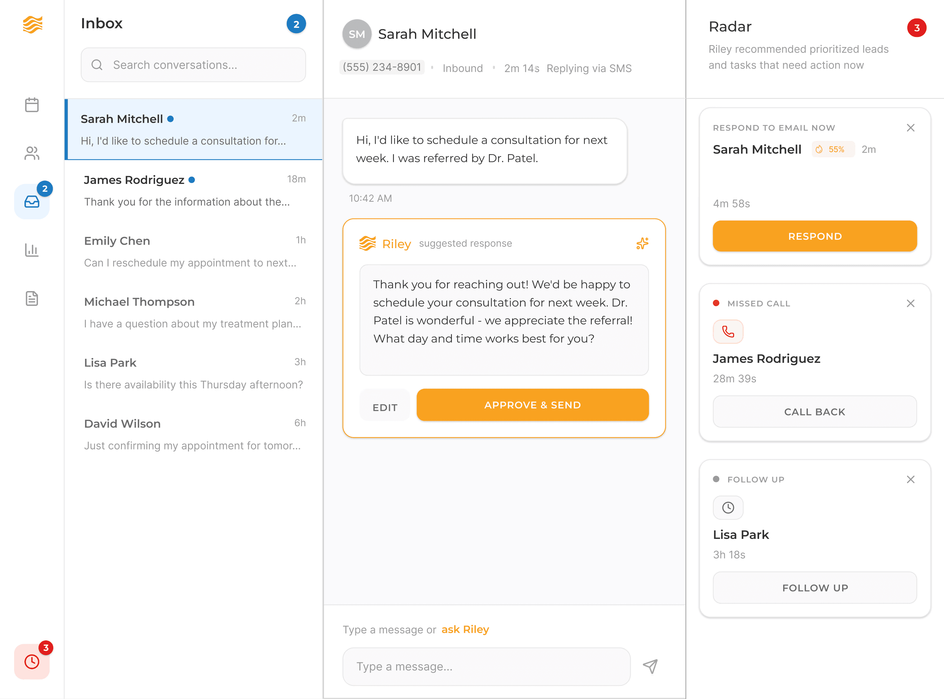 Riley is your AI agent that captures every lead the moment it comes, follows up with personalized outreach, and creates a prioritized daily action plan so your team can focus on delivering a world-class patient experience.